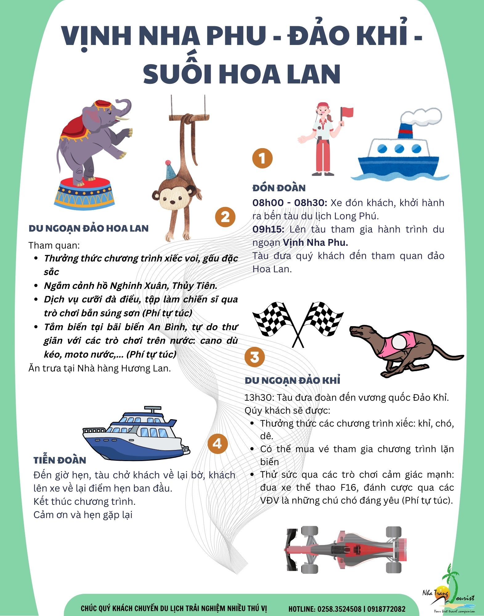 Bạn đã có dự định cho chuyến đi của mình chưa? Đến với thành phố biển Nha Trang xinh đẹp, ghé thăm vịnh Nha Phu tham quan đảo Hoa Lan với nhưng động lan khoe sắc rực rỡ, trãi nghiệm cưỡi voi, cưỡi đà điểu... thư giản với hồ tắm tiên, hồ thủy lực, khám phá đảo Khỉ vui chơi với những chú khỉ hiếu động, tham gia các trò chơi đua khỉ, đua xe F1 và nhiều hoạt động hấp dẫn khác....