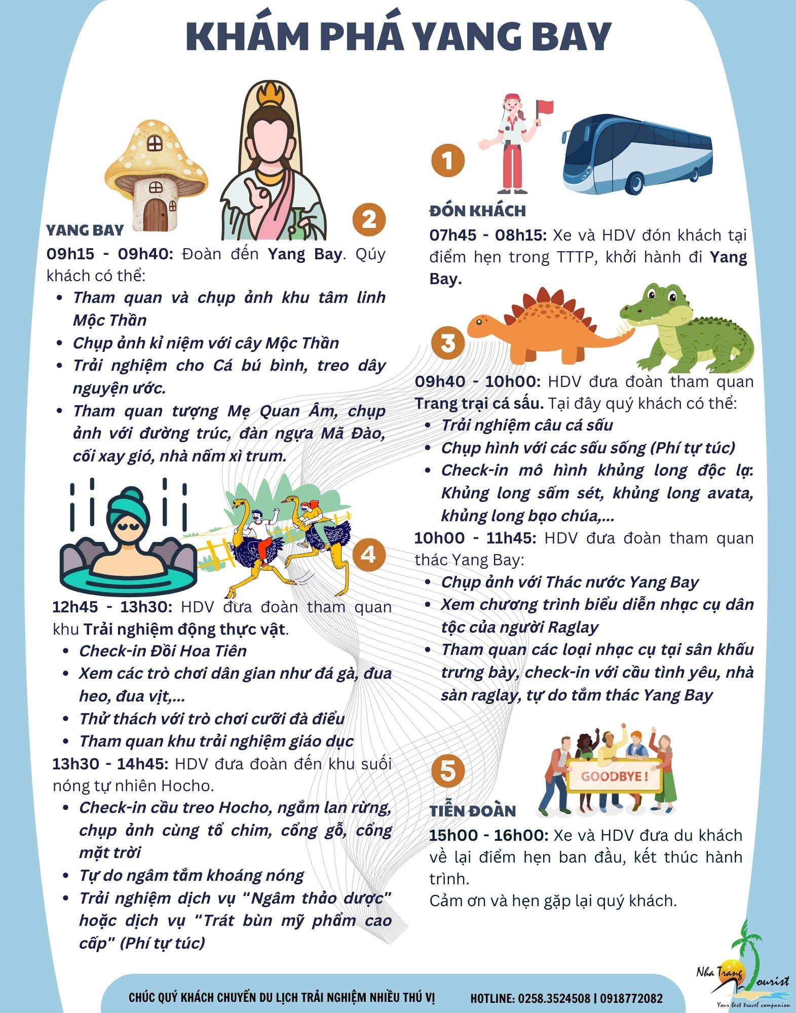 Khi đến với thành phố Nha Trang, nếu như bạn đang muốn tìm một điểm tham quan đẹp tựa thiên đường lại có thể ngắm trọn khung cảnh thiên nhiên núi rừng hùng vĩ cùng tham gia các hoạt động vui chơi, thám hiểm đầy hấp dẫn...vậy hãy cùng Nhatrangtourist khám phá thác Yangbay kỳ thú, thư giản tắm suối, tắm khoáng, thưởng thức các tiết mục biểu diễn dân tộc, trãi nghiệm câu cá xấu, đua heo, đá gà...