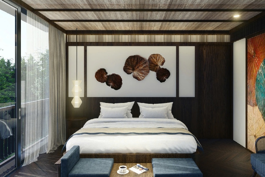 Thiết kế không gian nghỉ dưỡng chú trọng nhiều chi tiết bằng gỗ. Nhờ vậy mà giúp người ta thoải mái và cũng tạo sự gần gũi hơn với thiên nhiên. Cảm giác vừa hiện đại lại có chút cổ điển. Điểm nhấn nhẹ nhàng từ các chi tiết trang trí hình lá cây, hoa cỏ cũng góp phần giúp không gian trở nên đặc biệt và thu hút hơn.