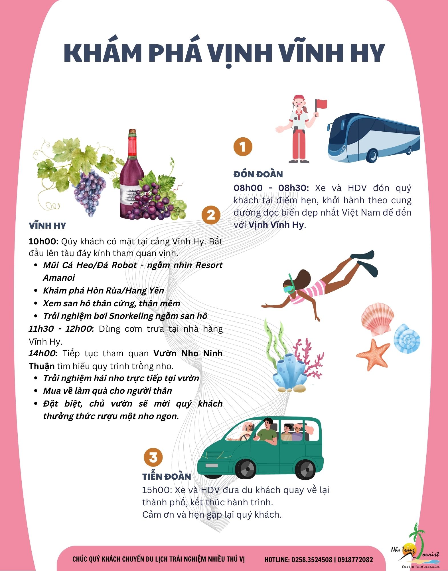 Tham gia tour 1 ngày khám phá vịnh Vĩnh Hy của NhaTrangTourist, bạn sẽ được trải nghiệm vẻ đẹp hoang sơ của một trong những vịnh biển đẹp nhất Việt Nam! Xuất phát từ Nha Trang, hành trình đưa bạn qua cung đường biển tuyệt đẹp đến vịnh Vĩnh Hy. Với xe đưa đón hiện đại, hướng dẫn viên nhiệt tình và dịch vụ trọn gói, NhaTrangTourist cam kết mang đến một ngày tràn đầy niềm vui và khám phá.
