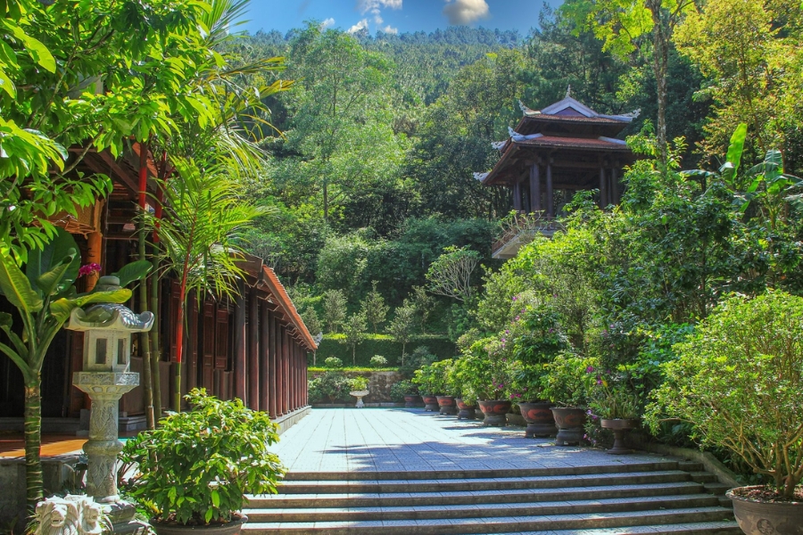 Men theo con đường dẫn vào chùa, bạn sẽ tận mắt chứng kiến phong cảnh hài hòa. Tất cả gợi lên một bức tranh thủy mặc với sự yên tĩnh, tiếng chim hót líu lo. Đồng thời, tiếng côn trùng kêu lao xao đã tạo nên sự an yên đến lạ, du khách như bỏ lại mệt mỏi, căng thẳng lại phía sau.