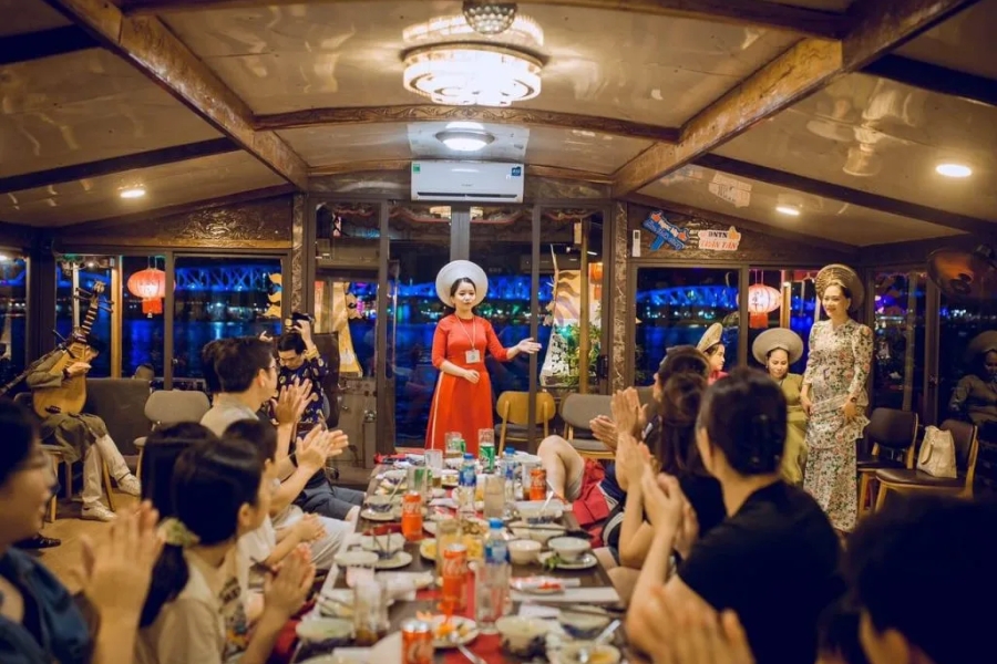 18h00: Xe và HDV đưa đoàn di chuyển ra bến tàu, bắt đầu trải nghiệm một trong những trải nghiệm không thể bỏ qua khi đến Huế – ăn tối trên du thuyền sông Hương, thưởng thức ca Huế ngọt ngào và thả hoa đăng cầu bình an. Cảm nhận từng làn điệu dân ca vang lên giữa dòng sông Hương thơ mộng, ánh đèn phản chiếu trên mặt nước lung linh – một khoảnh khắc khó quên trong đời! (Hành trình từ 18h45 – 20h45)