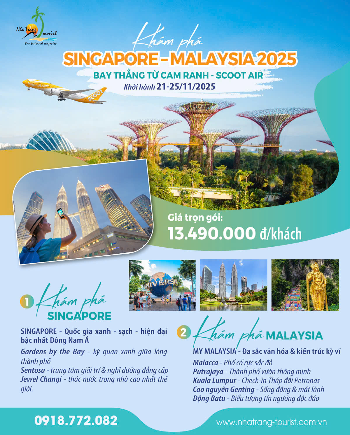 Nhân dịp hãng hàng không Scoot Air khai trương đường bay thẳng Singapore – Cam Ranh, NhaTrangTourist sẽ đồng hành cùng Quý Anh Chị làm trong ngành du lịch khám phá và trải nghiệm tại hai điểm đến Malaysia và Singapore. Với cảnh quan thiên nhiên tươi đẹp, Bán đảo Cọ dầu và Đảo quốc Sư tử luôn là điểm đến hấp dẫn của du khách Việt Nam. Ở đây, du khách không chỉ được tận hưởng một môi trường Xanh – Sạch – Đẹp vào loại bậc nhất mà còn được đắm mình trong niềm vui của cuộc sống hiện đại, hấp dẫn. Nếu công trình kiến trúc Tháp Đôi Petronas cao nhất thế giới cùng Thánh Đường Hồi Giáo Quốc Gia là biểu tượng của sự thống nhất, niềm tin và sự khát vọng vươn cao của Liên bang Malaysia thì Singapore lại luôn tự hào với một Orchard Road – Thiên đường mua sắm và một Sentosa xinh xắn, kỳ ảo luôn hấp dẫn du khách. Còn chờ đợi gì nữa, hãy cùng NhaTrangTourist tham gia chuyến Famtrip ý nghĩa và nhiều trải nghiệm thú vị này !