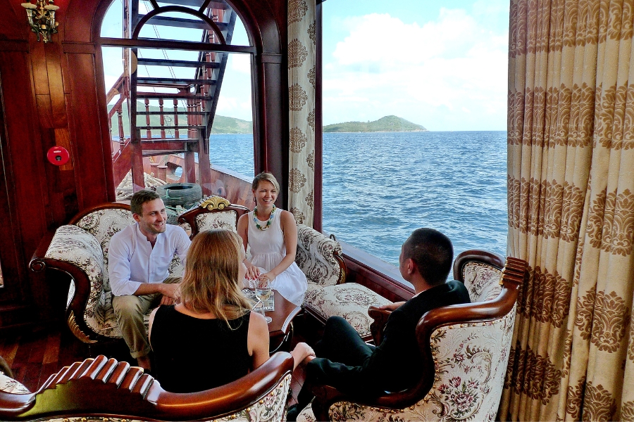 08h30: Quý khách lên tàu với sự chào đón của giám đốc trải nghiệm và đội ngũ nhân viên cùng với một ly mocktail tuyệt ngon và mát lạnh. Sau đó giám đốc trải nghiệm sẽ giới thiệu về Vịnh Nha Trang, về người dân địa phương, ẩm thực, văn hóa, về chỉ dẫn trên tàu, về Hoàng Đế Bảo Đại...vv trong khi tàu di chuyển cho quý khách ngắm nhìn phong cảnh biển tuyệt đẹp của vịnh Nha Trang.