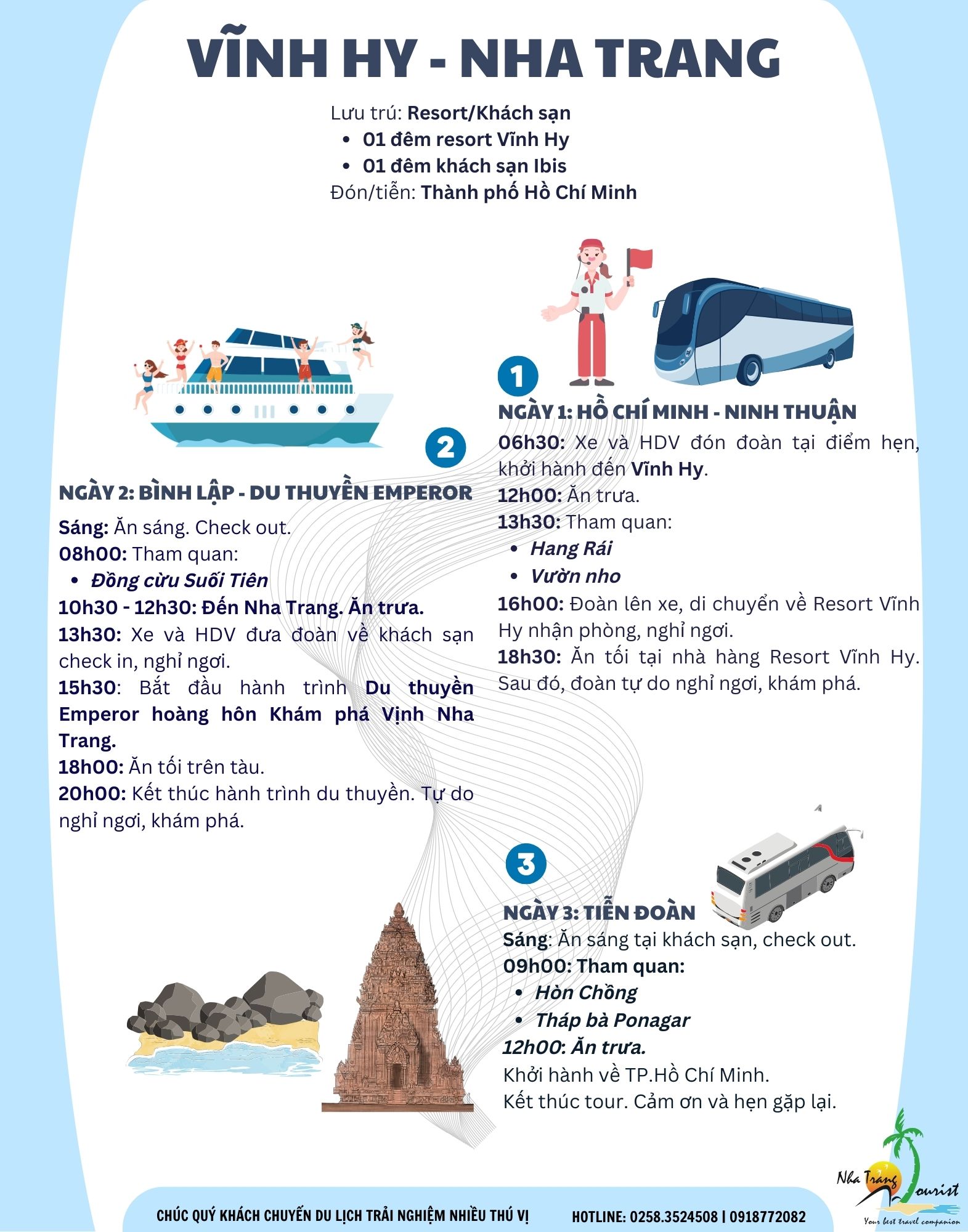 Khám phá vẻ đẹp biển đảo miền Trung với Tour Vĩnh Hy - Nha Trang 3 ngày 2 đêm, khởi hành từ TP.HCM! Thưởng ngoạn vịnh Vĩnh Hy hoang sơ, lặn ngắm san hô rực rỡ và tận hưởng khung cảnh hoàng hôn thơ mộng trên du thuyền Emperor Cruises của vịnh Nha Trang cùng các điểm đến nổi tiếng như Hòn Chồng, Tháp Bà Ponagar. Hành trình ngắn ngày nhưng trọn vẹn trải nghiệm đang chờ bạn! Đặt tour ngay tại NhaTrangTourist để bắt đầu kỳ nghỉ đáng nhớ!