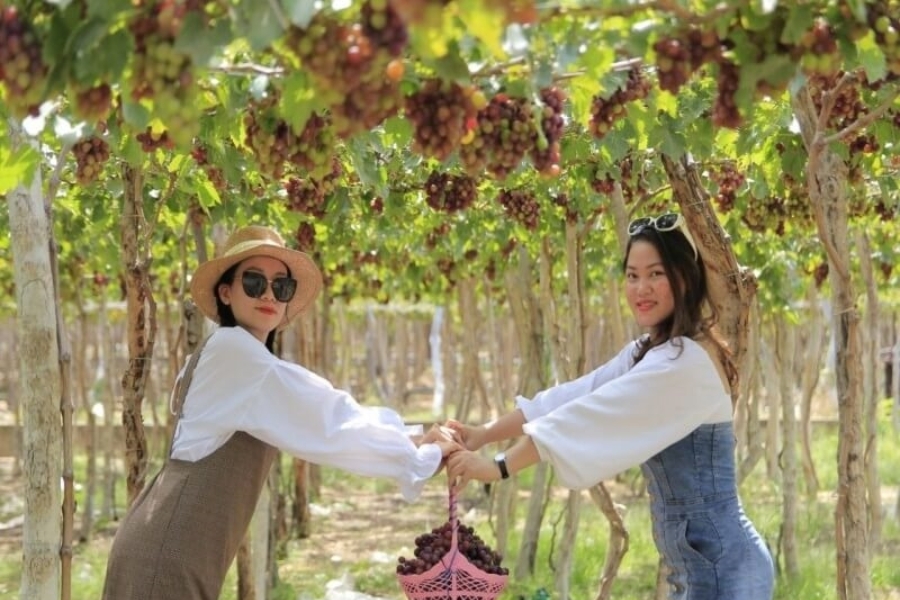 Vườn nho khi đến đây du khách sẽ được chiêm ngưỡng những giàn nho xanh, đỏ rợp bóng mát. Trong cái nóng oi ả của mùa hè, việc thưởng thức những chùm nho mát lạnh hay nhấp một ly siro nho đậm đà sẽ mang lại cảm giác sảng khoái và dễ chịu vô cùng. Đây cũng là cơ hội để bạn tự tay hái những chùm nho căng mọng và mua ngay tại vườn.