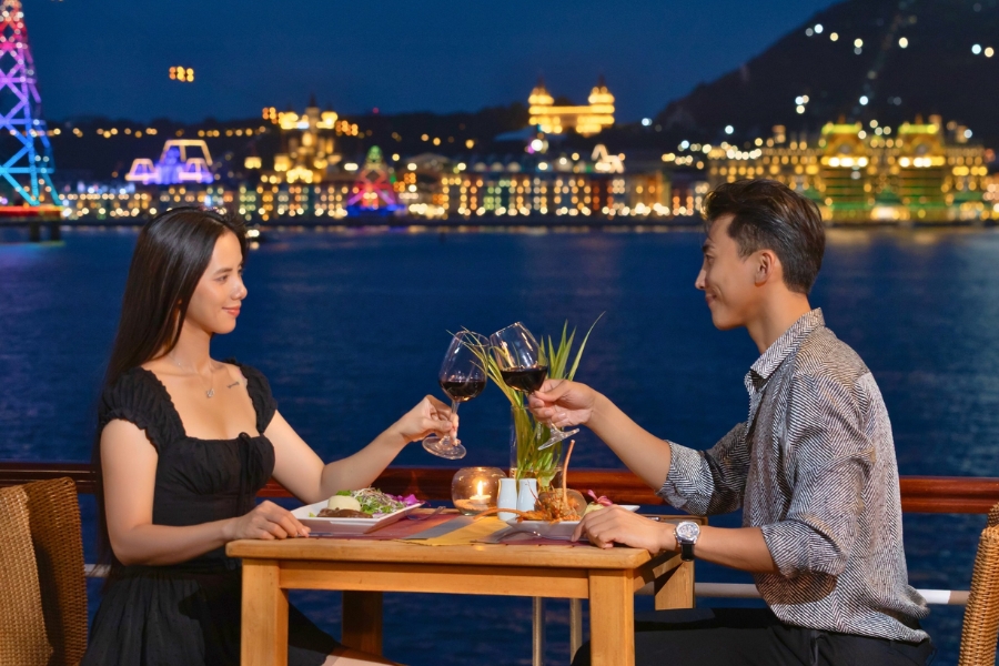 20h00: Kết thúc bữa tối lãng mạn và tiếp tục thưởng thức các loại đồ uống, cocktails ở phòng chờ hoặc trên boong tàu trước khi tàu di chuyển quay trở về cảng và xe ô tô sẽ đưa quý khách về khách sạn.